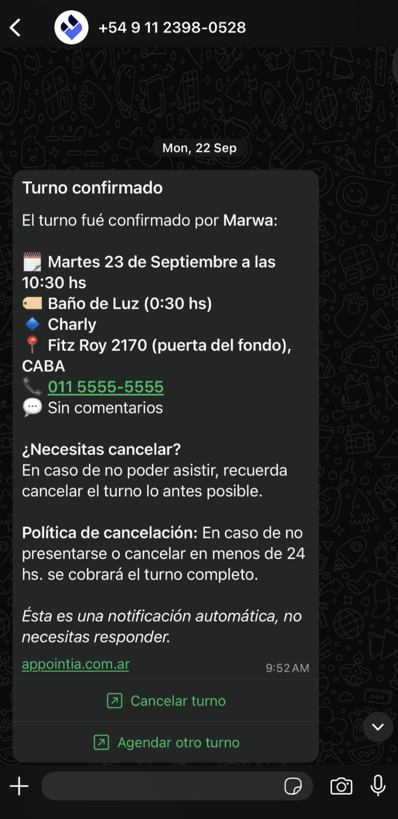 Le recordamos a tus clientes un día y 1 hora antes del turno.